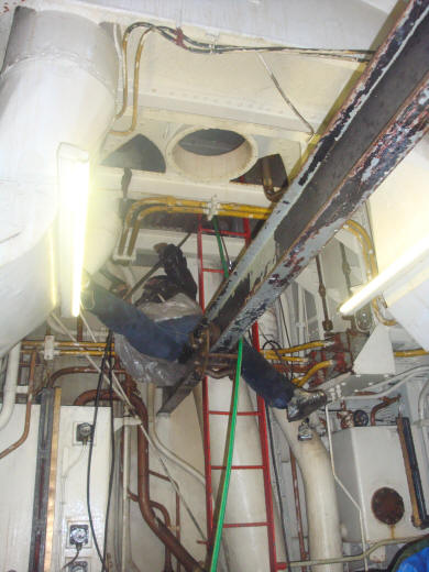 Met een enorme berg chemicalien van Vecom hebben we de boel grondig onvet, en met een hogedrukspuit schoongespoten. Ondanks het feit dat we duizenden liters water hebben weggespoten, hebben we maar 2 keer kortsluiting gehad, dus ook dat begint erop te lijken! (alle electra in de machinekamer zou waterdicht moeten zijn...)
