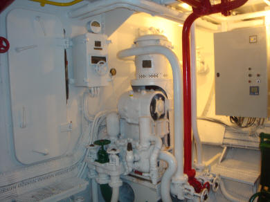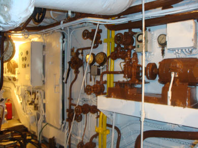 Voorsmeerpomp en smeerolievoorraadtanks, achter het hoofdschakelbord. |