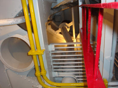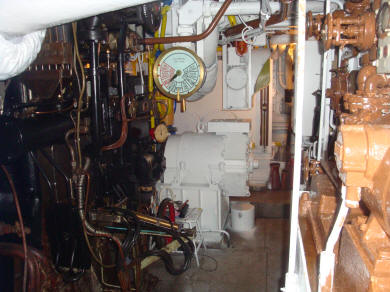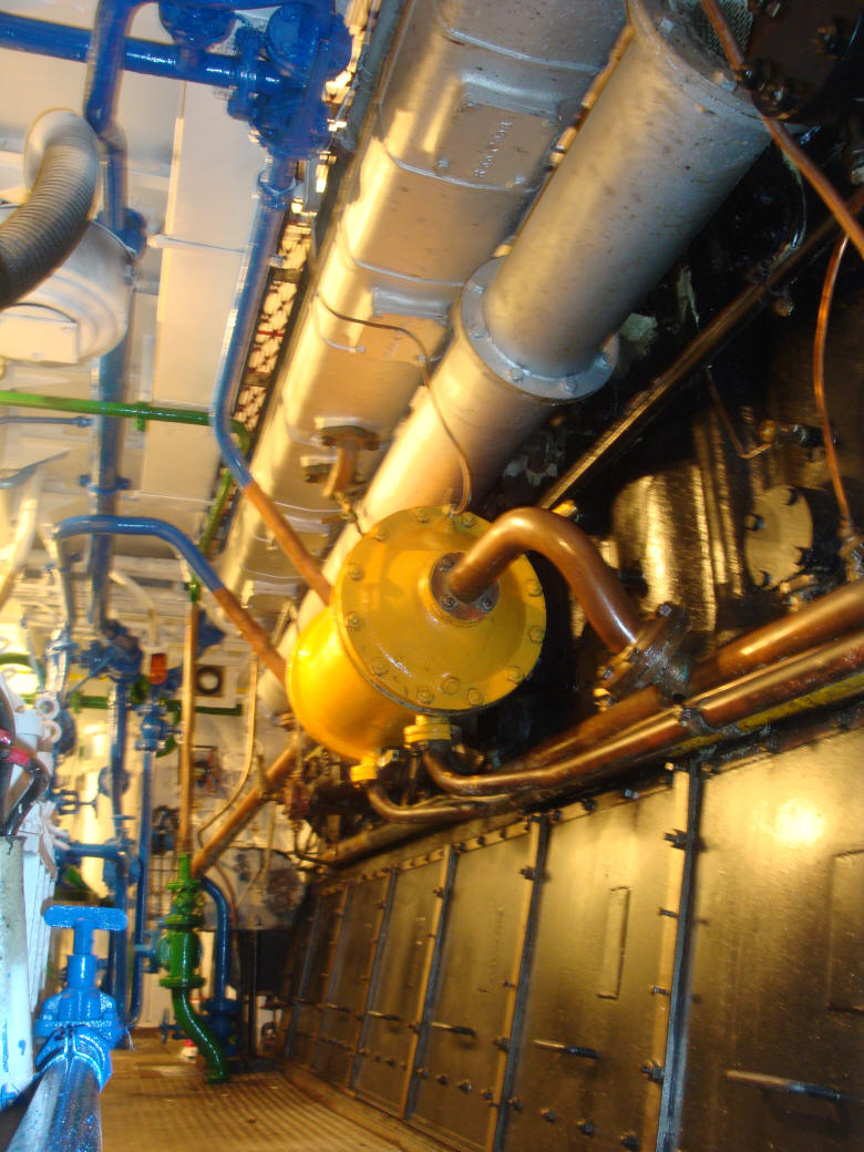 Stuurboordzijde hoofdmachine, met aangehangen smeeroliekoeler en carterdeuren. |